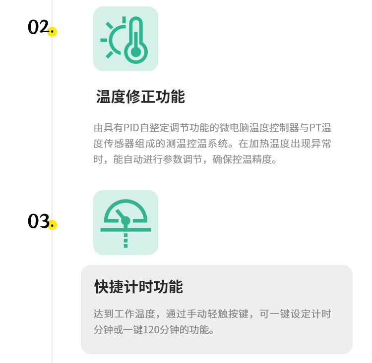 快捷計(jì)時(shí)功能:達(dá)到工作溫度,通過手動輕觸按鍵,可一鍵設(shè)定計(jì)時(shí)分鐘或一鍵120分鐘的功能。